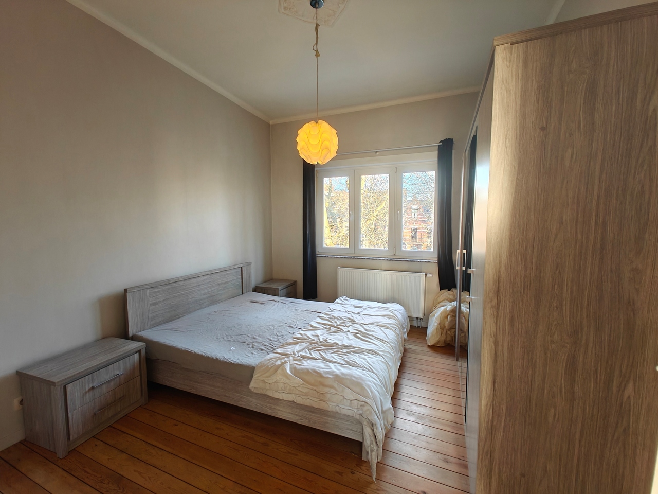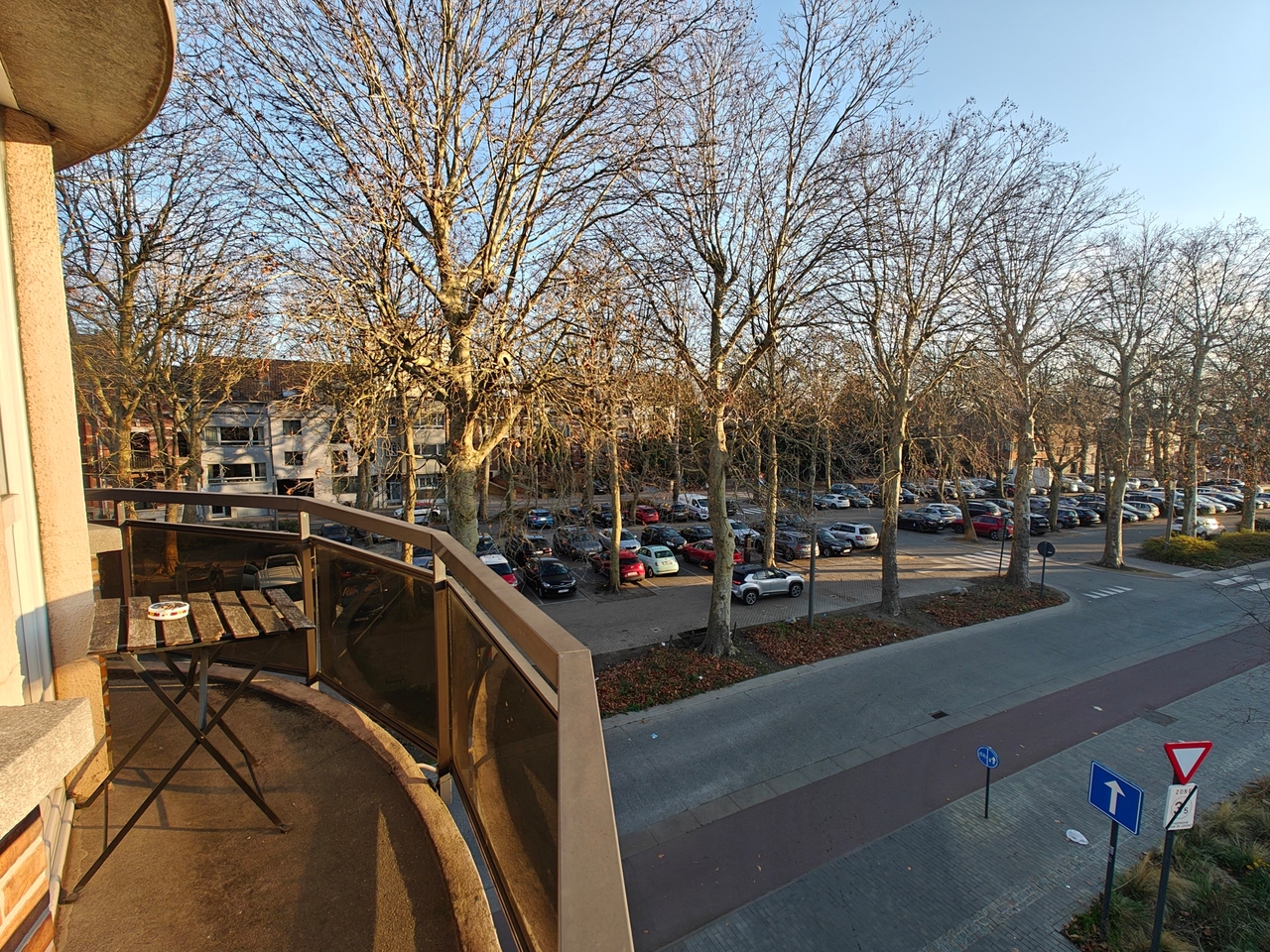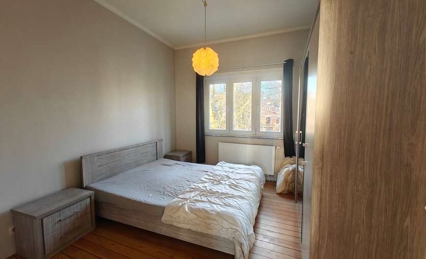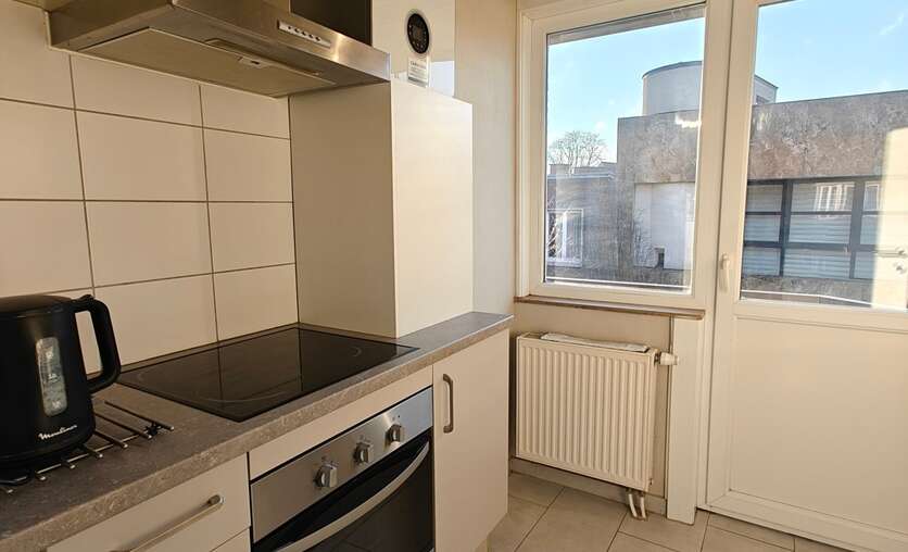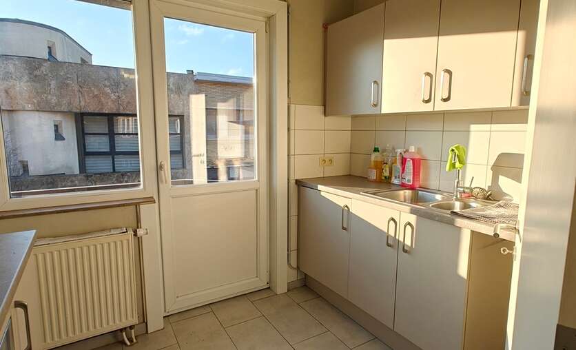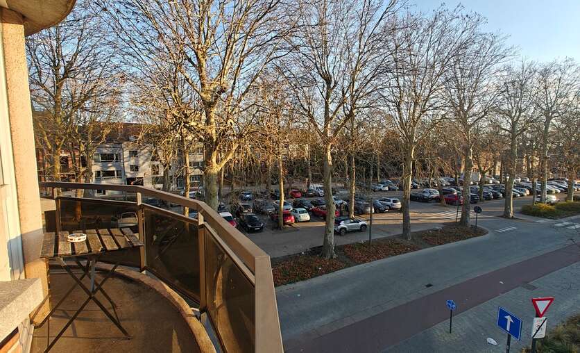 volledig vernieuwd appartement met 1 slaapkamers 12.50 m², ingerichte keuken, lichtrijke salon 18 m², eetplaats 11 m², douchekamer met lavabomeubel en WC, berging. Lage gemeenschappelijke lasten € 20. Mooi uitzicht op het Rooseveltplein met haar plataan bomen.